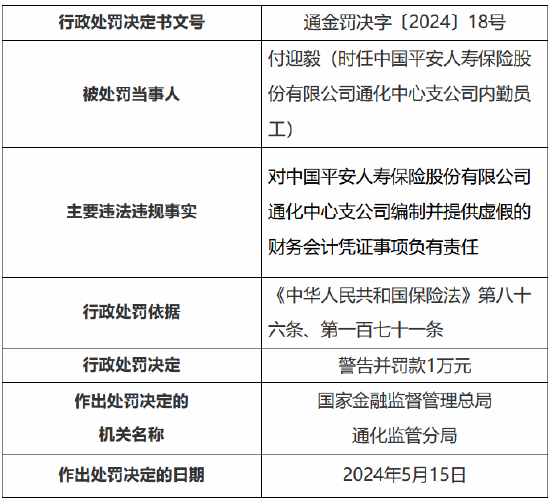 时任中国祯祥东说念主寿保障股份有限公司通化中心支公司内勤职工付迎毅,对公司编制并提供空幻的财务管帐左证事项负有包袱,受到训诫并被罚金1万元。