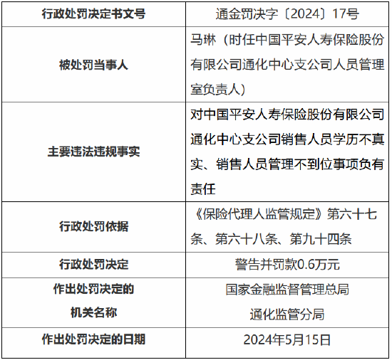 时任中国祯祥东说念主寿保障股份有限公司通化中心支公司东说念主员处置室崇拜东说念主马琳,对公司销售东说念主员学历不真确、销售东说念主员处置不到位事项负有包袱,受到训诫并被罚金0.6万元。
