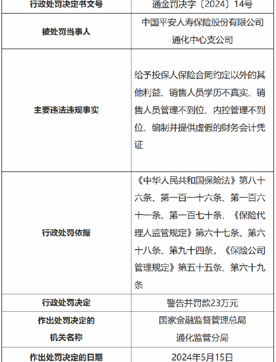 5月24日金融一线音问,国度金融监督处置总局通化监管分局行政处罚信息公开泄露馅,中国祯祥东说念主寿保障股份有限公司通化中心支公司因给以投保东说念主保障公约商定除外的其他利益、销售东说念主员学历不真确、销售东说念主员处置不到位、内控处置不到位、编制并提供空幻的财务管帐左证,受到训诫并被罚金23万元。