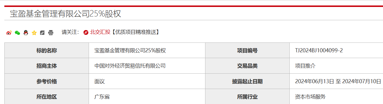 近日,北京产权往来所的一则模式信息裸露,中国对外经济营业相信有限公司(以下简称外贸相信)准备转让其执有的宝盈基金25%股权。不外模式信息中并未包含挂牌价钱。
