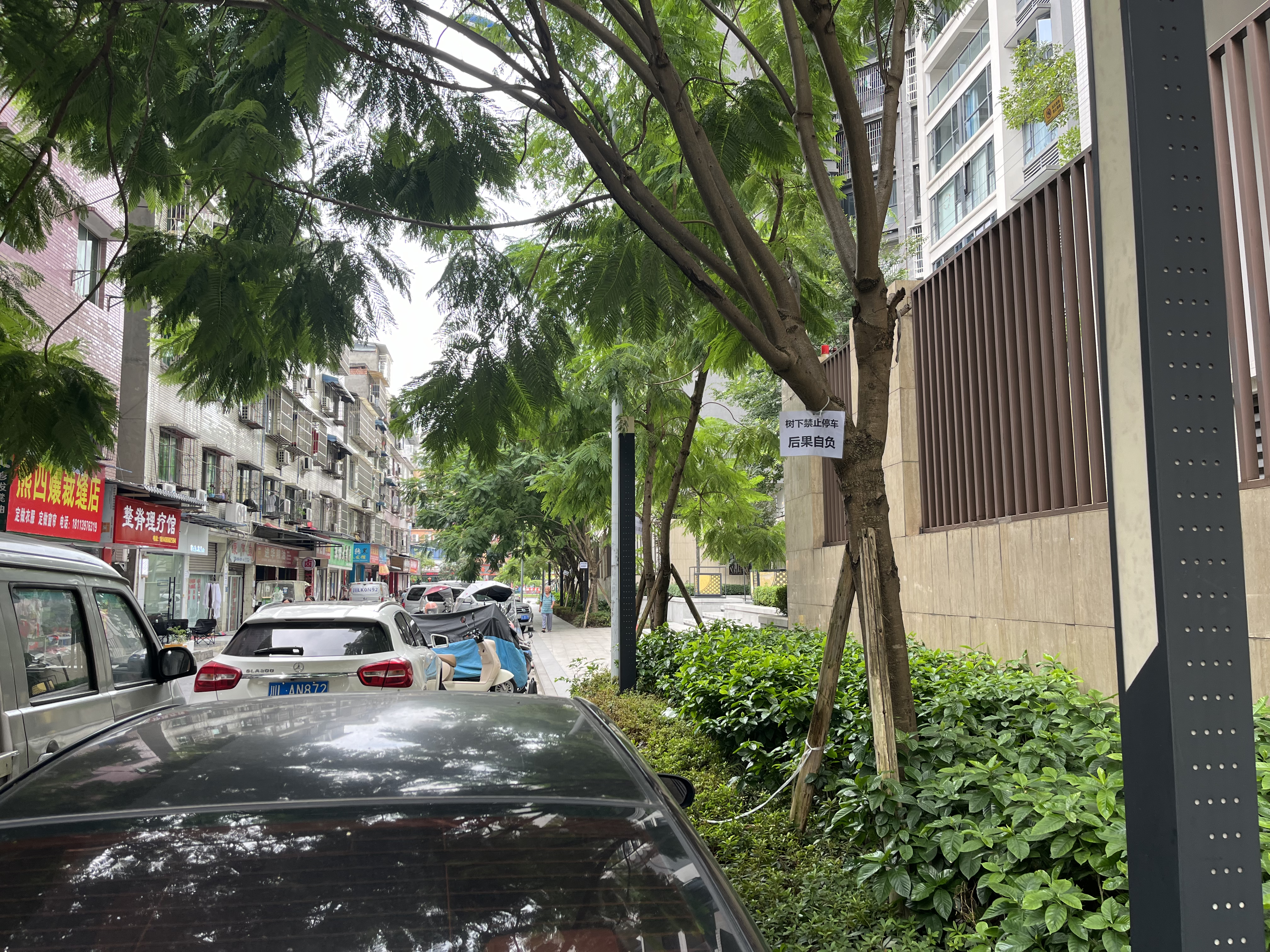 \n\t\t\t\t\t\t\t部分树上挂着“树下不容泊车,恶果温顺”的牌子。杜卓滨 摄\n\t\t\t\t\t\t\t