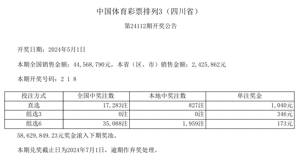 中国体育彩票胪列3第24112期宇宙销售金额:44568790元。开奖号码:2 1 8。